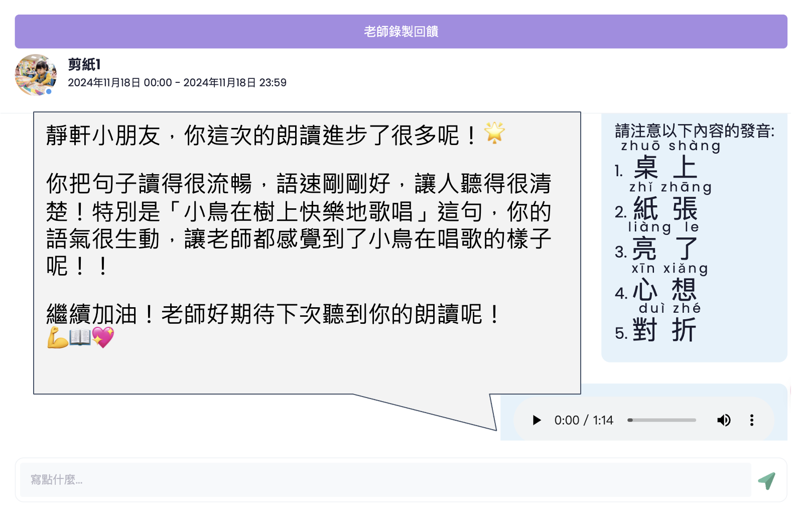 🔹 Personalized feedback from real teachers – Beyond pronunciation correction and reading techniques, we also focus on helping children express themselves better in Chinese.